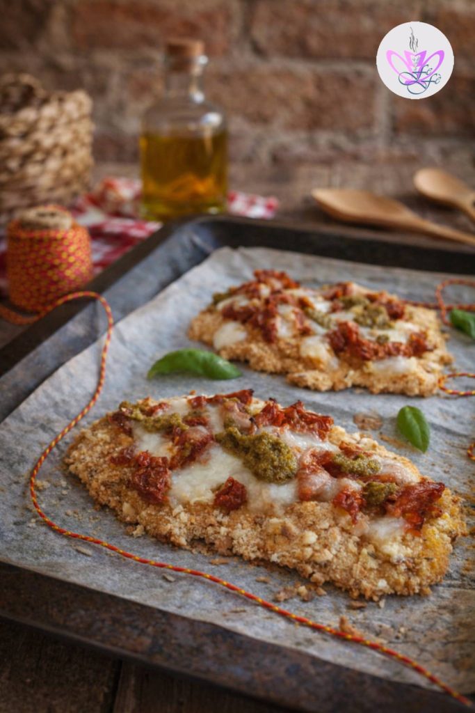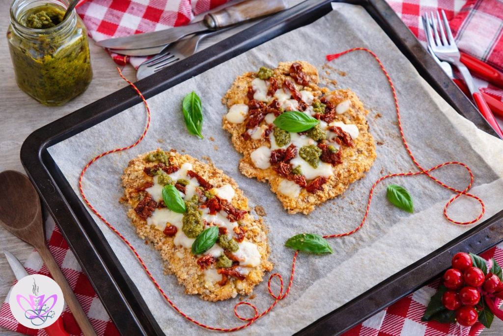 Aujourd’hui, je vous propose l’une de ces recettes super rapides et délicieuses, qui en quelques gestes simples vous permettront de servir un plat principal vraiment exceptionnel ! Des ingrédients à la portée de tous, mais de qualité rigoureuse, en commençant par le choix de la viande blanche. Je vous conseille donc de l’acheter fermier, c’est-à-dire non issue d’élevages intensifs où le traitement médicamenteux est devenu une norme. Choisissez toujours des blancs de dinde certifiés et d’origine certaine, avec des indications sur l’alimentation et éventuellement sur le traitement. Cela étant dit, le reste est tout simple, car il faudra vraiment très peu de temps pour réaliser ce plat succulent, riche et nourrissant. Il s’agit de blancs de dinde panés et agrémentés de morceaux de tomates séchées, de mozzarella et de quelques cuillères par-ci par-là de pesto au basilic parfumé. Réalisés presque comme une parmigiana, d’où le nom ! Un régal pour les yeux et le palais, croyez-moi ! Ceux qui connaissent ma cuisine savent bien que je ne suis pas une grande amatrice de viande, je dois l’admettre, je propose rarement des recettes mettant la viande en vedette. Néanmoins, je tiens particulièrement à recommander celle-ci pour son agréable saveur dès la première bouchée ! Soyez sûrs que toute la famille appréciera, même les plus jeunes et exigeants !