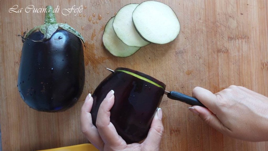 Commencez par laver les aubergines très bien sous l’eau courante, puis coupez-les en éliminant le pédoncule et tranchez-les dans leur largeur à une épaisseur d’un demi-cm.