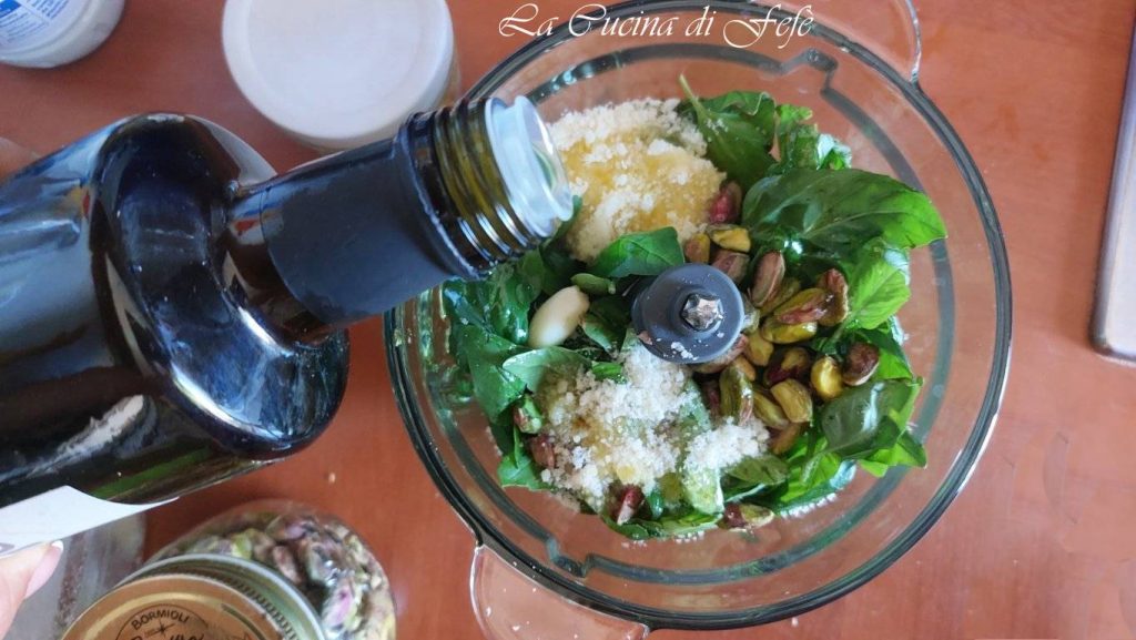 Transférez le basilic dans un mixeur avec une gousse d’ail, les pistaches et le parmesan râpé.