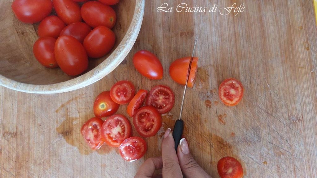 Couvrez uniformément avec quelques cuillères de sauce tomate et 2-3 cuillères de pesto de basilic et créez une deuxième couche de tomates cerises en rondelles. Salez et poivrez à votre convenance.
