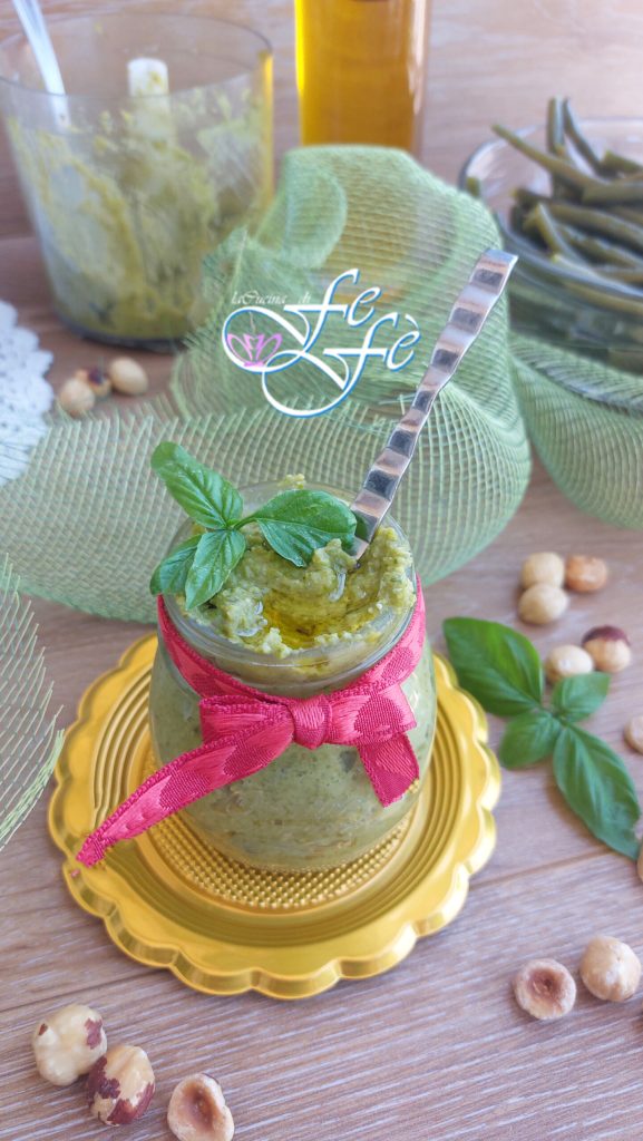 Sur les réseaux sociaux, beaucoup me surnomment la reine des pestos faits maison, peut-être parce que depuis que j’ai ouvert mon premier blog, j’en ai expérimenté de toutes sortes ! J’aime beaucoup exploiter les propriétés bénéfiques des légumes de saison, en créant également des assaisonnements pour mes premiers plats, que je prépare toujours en abondance pour les congeler et en avoir des réserves pendant l’année, même lorsque ce légume n’est plus de saison. Le pesto de haricots et noisettes grillées en fait partie, un concentré de bienfaits grâce à leur grande teneur en vitamines A et C, en sels minéraux et en antioxydants naturels comme la lutéine et le bêta-carotène. Ces propriétés aident à combattre les radicaux libres, principaux responsables du vieillissement cellulaire, et donc à avoir une fonction antioxydante marquée. Tout cela est possible uniquement si vous consommez ces légumes cuits à la vapeur, car toutes les propriétés nutritives ne se disperseront pas dans l’eau de cuisson, le saviez-vous ? C’est donc un mode de cuisson que je recommande pour tous les légumes en général, mais à mon avis, pour préparer ce pesto, la cuisson à la vapeur est plutôt recommandée ! Pour sa bonne réussite, il est donc important de cuire les haricots parfaitement, c’est-à-dire cuits mais pas trop mous, ni spongieux à cause de l’excès d’eau absorbée. Le reste est facile, des ingrédients de qualité comme le parmesan et le pecorino, ce dernier dans mon cas sicilien AOP ! Et puis les noisettes, le choix est vraiment important, j’ai choisi celles du Piémont, particulièrement adaptées à la torréfaction, pour donner au pesto un parfum et un arôme vraiment uniques ! À l’état pur, ce pesto peut être la sauce d’accompagnement parfaite pour fromages, viandes et poissons. Une sauce légère à servir également comme apéritif, tartinée par exemple sur des bruschettas, ou pour garnir des vol-au-vent, et tempéré avec l’eau de cuisson, ce sera l’assaisonnement idéal pour des plats de pâtes à tomber par terre. Et à ce propos, suivez-moi car j’ai réalisé un plat de pâtes à base de ce pesto qui vous ravira dès la première bouchée !