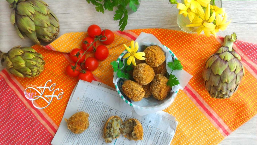 Ça vous est déjà arrivé d’ouvrir le frigo et de ne pas savoir quoi cuisiner ? Peut-être que vous manquez de nombreux ingrédients et que vous devez encore faire les courses, préparer un dîner devient une tâche ardue ! Voici une astuce au cas où vous auriez des restes de risotto, comme cela m’est arrivé ! Comme on dit, ne rien jeter, voici une manière très agréable de surprendre vos amis et votre famille ! Je les aurais aussi appelées boules de riz improvisées, parce qu’une fois c’était vraiment comme ça ! La situation était critique : le frigo presque vide, un seul œuf et du pecorino râpé. J’ai improvisé avec ce que j’avais, presque inconsciente du résultat extraordinairement bon que j’allais obtenir ! En quelques gestes simples, vous aurez préparé une recette maline, rapide et savoureuse ! Cela m’a rappelé le bon vieux temps, quand en marchant dans la rue principale de Catane, avec mon mari, nous nous arrêtions dans l’un de nos bars préférés et faisions le plein de petites boules de riz chaudes ! Ma version est naturellement au four, donc plus saine, mais pas moins gourmande pour autant. À l’intérieur, un risotto à base d’artichauts et de petits pois, assaisonné avec du bon pecorino râpé, puis passé dans l’œuf et enfin pané ! Un délice ! Elles sont excellentes comme antipasti finger food ou même comme plat principal végétarien à accompagner d’une salade fraîche. Une fois faites, vous les referez toujours !