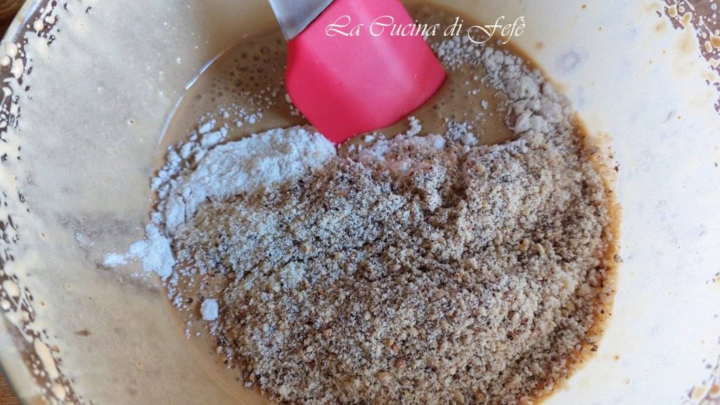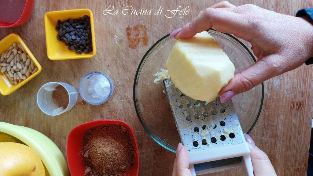 • À ce stade, incorpore également la pomme râpée, les pignons légèrement hachés au couteau et les pépites de chocolat.