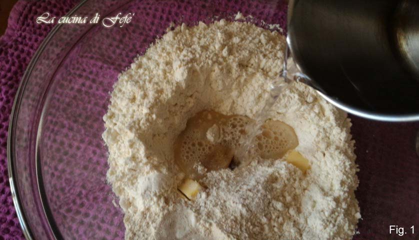 Dans un grand bol, mélangez les deux farines, le sucre, le beurre froid coupé en morceaux, le sel et créez un puits au centre. Ajoutez la levure mère déshydratée et versez progressivement l’eau légèrement tiède (fig. 1).