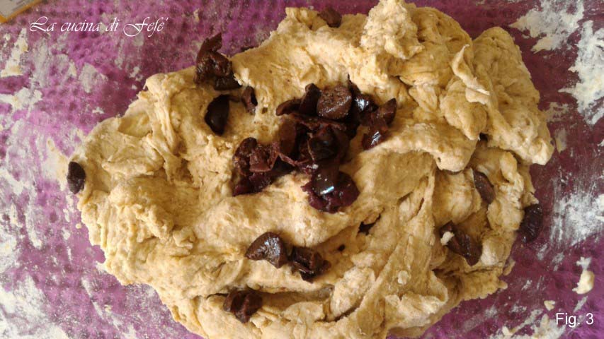 Ensuite, continuez avec les mains. Lorsque la pâte est presque prête, incorporez les olives coupées en morceaux (fig. 3).