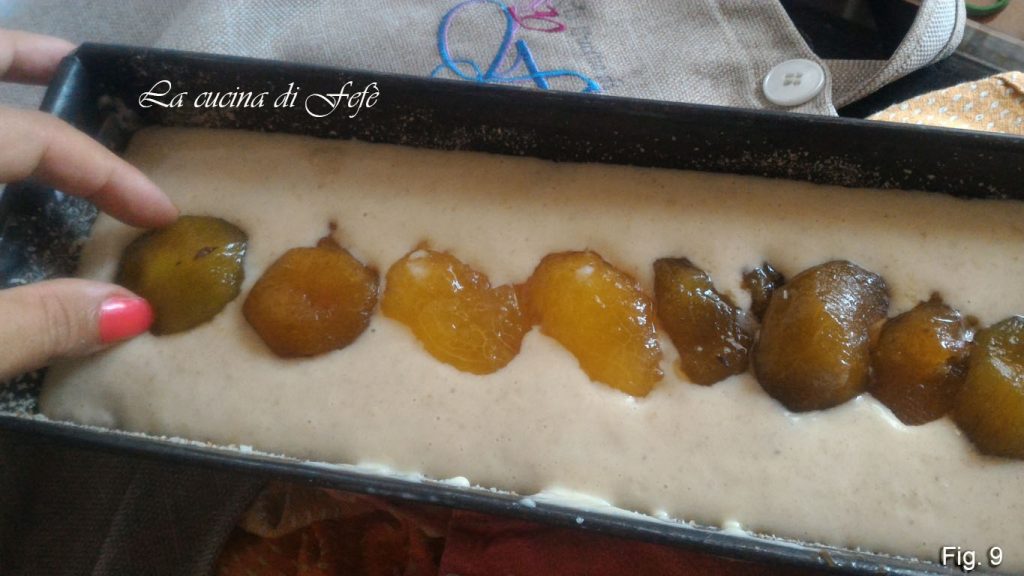• Transférez la pâte dans un moule à cake préalablement huilé ou beurré et saupoudré de chapelure, nivelez bien et garnissez avec les prunes plus fermes coupées en deux (fig. 9).