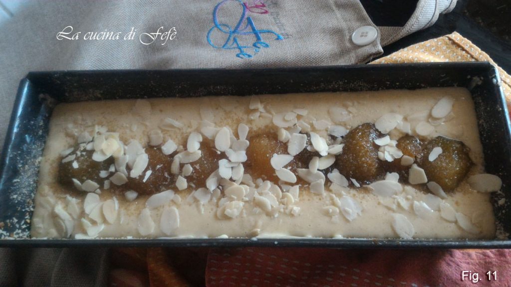• Ajoutez enfin aussi les amandes effilées et mettez au four préchauffé à 180°C pendant 45′-50′. Les dernières minutes de cuisson, si la surface devient trop foncée, couvrez-la avec une feuille de papier sulfurisé et poursuivez pendant le temps indiqué. Avant d’éteindre, effectuez toujours le test du cure-dents pour vérifier la cuisson (fig. 11).