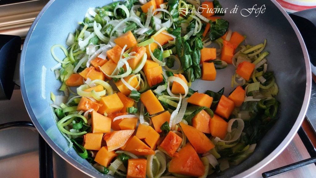 Ensuite, ajoute également les cubes de citrouille et fais revenir encore quelques minutes à feu vif.