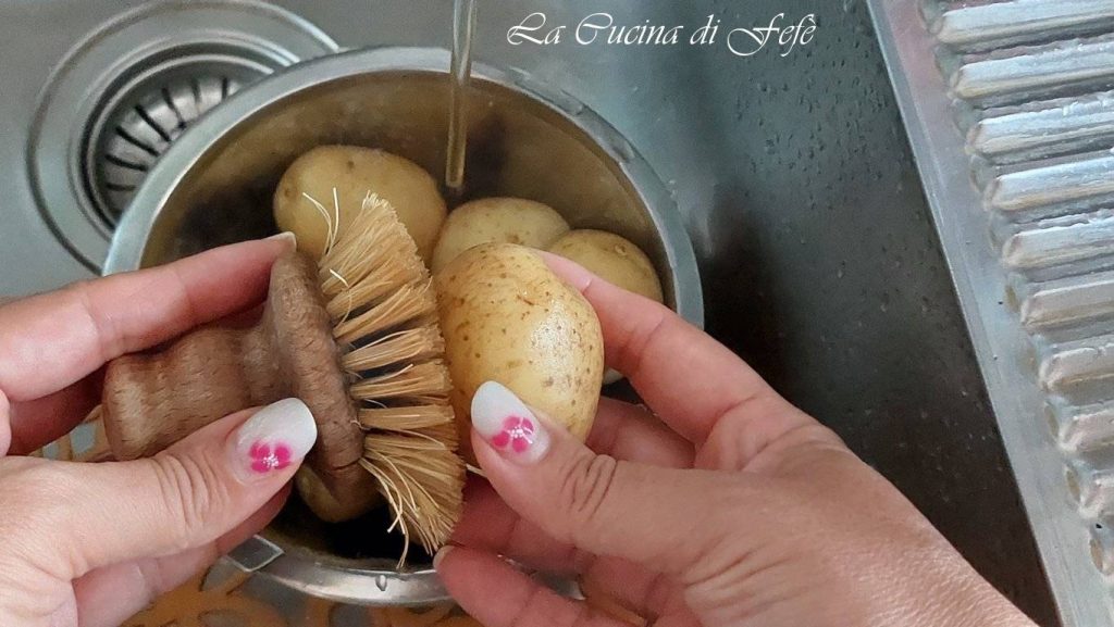 Commencez par laver les pommes de terre sous l’eau courante en veillant à les brosser très bien pour éliminer toute trace de terre, car dans cette recette elles seront consommées avec la peau.