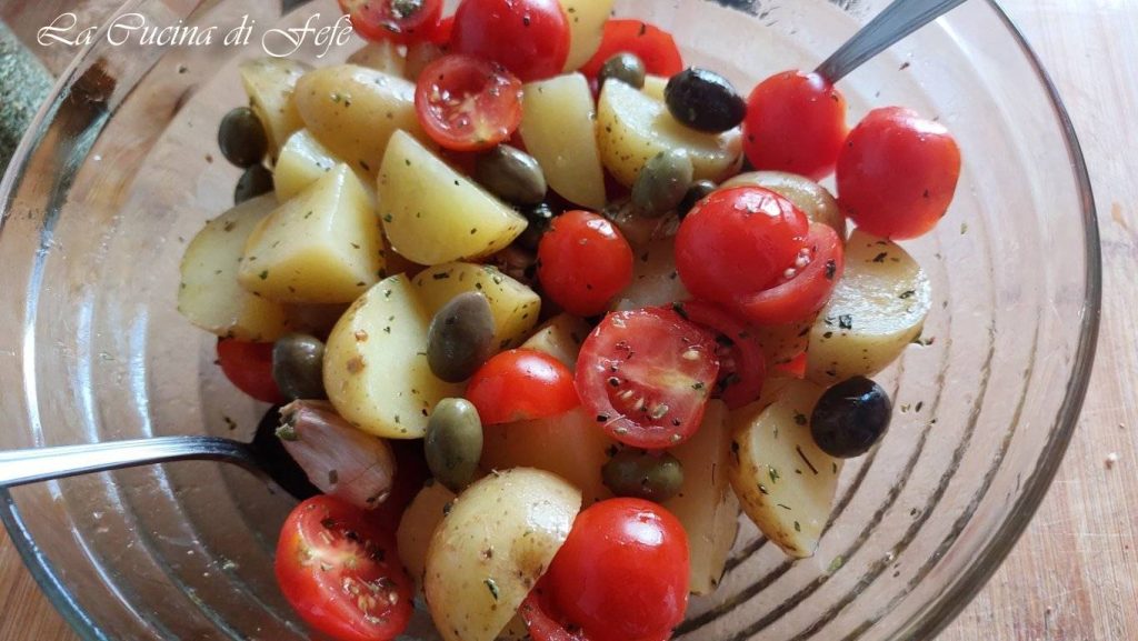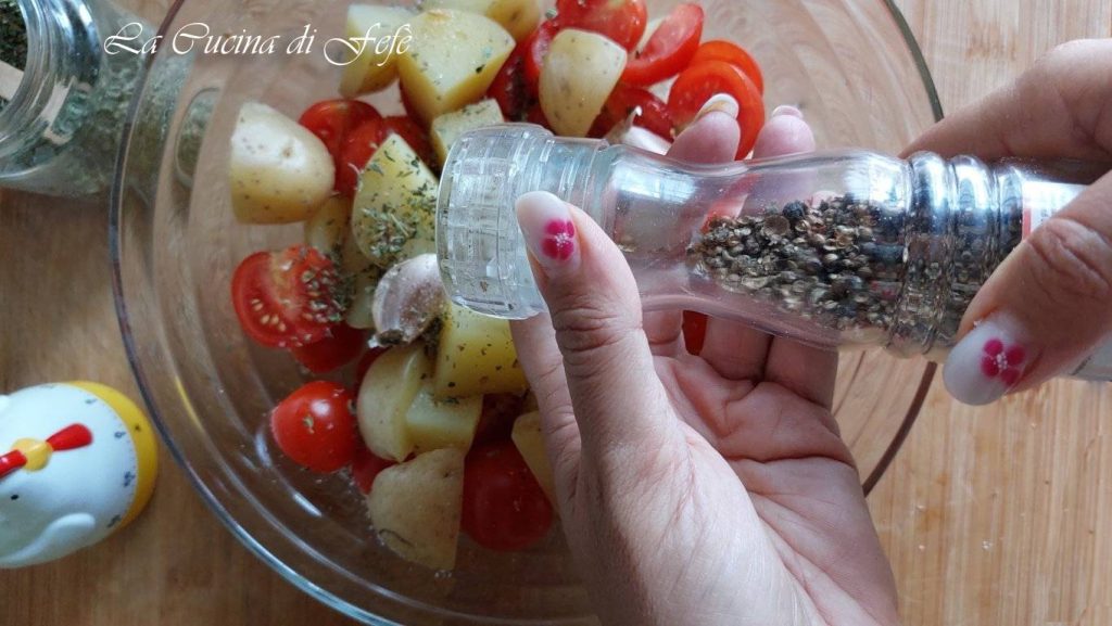 Une fois refroidies, transférez les pommes de terre dans un grand bol, ajoutez les tomates cerises préalablement lavées et coupées en deux, 2 gousses d’ail en chemise et l’origan.