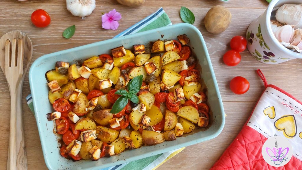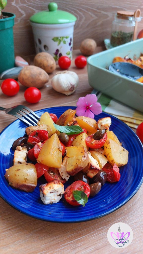 L’été évoque toujours la Grèce pour moi, car presque chaque année, mon mari et moi choisissons d’aller explorer une nouvelle et différente île grecque ! Là-bas, nous sommes conquis par de nombreuses choses, indubitablement la mer, mais aussi les gens charmants et la cuisine assez simple et maison, mais je pense que c’est justement cela le véritable charme ! L’influence de ces saveurs méditerranéennes sur certains de mes plats est désormais bien connue, tant et si bien que par le passé, j’ai souhaité reproduire les célèbres crevettes saganaki, un de leurs plats phares, et j’ai également créé un couscous à la grecque ! La feta d’ailleurs, leur fromage par excellence, accompagne souvent mes préparations, ainsi, l’autre jour, ayant justement les ingrédients pour faire la célèbre salade dans le frigo, j’ai pensé qu’il serait intéressant de les utiliser pour assaisonner les pommes de terre ! Un jeu d’enfant. On blanchit les pommes de terre quelques minutes, on les assaisonne avec le reste des ingrédients et ensuite on met le tout au four ! En un peu plus d’une demi-heure, la cuisine sera envahie d’un délicieux parfum ! Et voilà, en trois étapes simples, j’ai apporté à table d’irrésistibles pommes de terre à la grecque! Rien de plus savoureux ! Un accompagnement végétarien facile et rapide qui plaira à toute la famille ! Un véritable concentré de saveurs et de senteurs à préparer même à l’avance comme entrée mais il sera également parfait comme plat unique ou plat principal ! Bref, une préparation riche, polyvalente et colorée qui mettra de la gaieté à table et saura conquérir même les palais les plus exigeants !