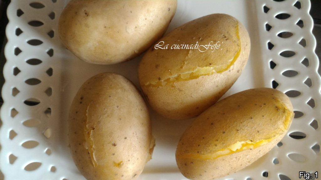 Lavez très bien les pommes de terre en gardant la peau intacte. Placez-les dans une casserole avec de l’eau salée et cuisez-les pendant 20-25 minutes à partir de l’ébullition. Égouttez-les et laissez-les refroidir complètement (fig. 1).