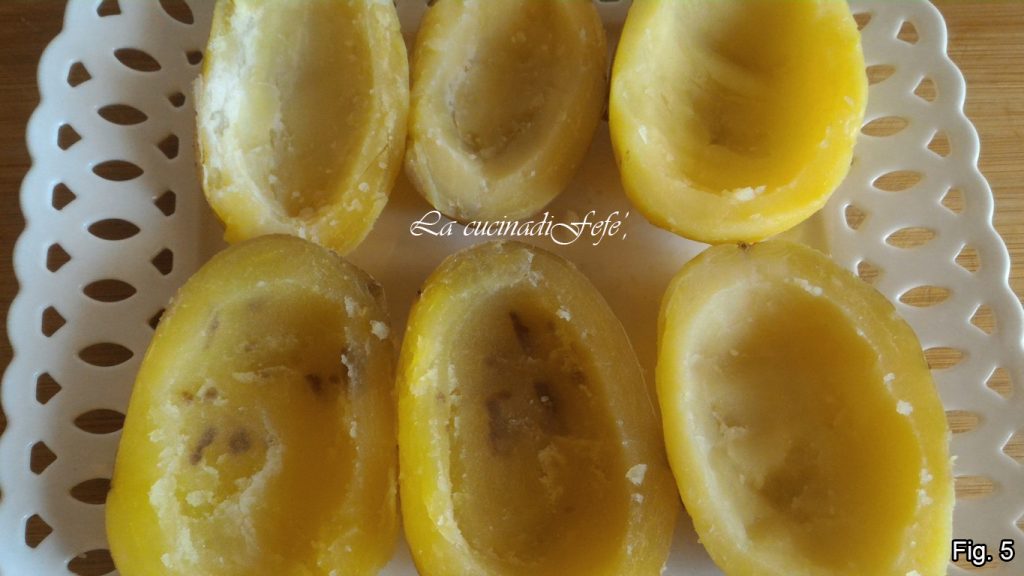 🟣* Pour évider la chair des pommes de terre, je vous conseille de procéder de cette manière: 1) incisez avec la pointe d’un petit couteau le bord des pommes de terre, en calculant environ 1 cm au moins; 2) commencez à évider la chair au centre avec l’évideur et finissez le bord avec le même petit couteau pour le perfectionner et éviter en même temps de le casser.