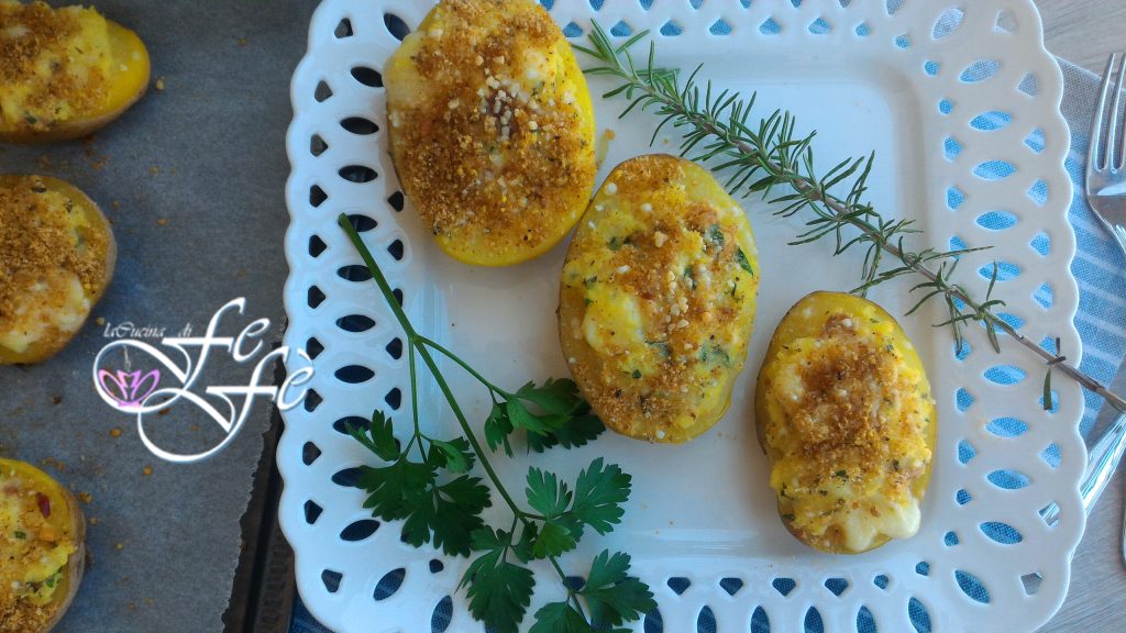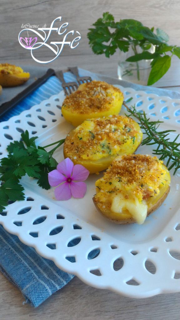 Je dois admettre que parfois les recettes que je propose sur le blog s’inspirent de discussions téléphoniques avec des amies ou des membres de la famille! Ces pommes de terre farcies au four, par exemple, sont nées d’une de ces longues et fructueuses conversations, et je dois dire qu’une fois en cuisine, le résultat a été vraiment surprenant! Bien sûr, je vous propose ma version personnelle, mais rien ne vous empêche, si vous le souhaitez, d’apporter quelques variantes selon vos goûts ou les ingrédients dont vous disposez! Elles sont vraiment polyvalentes et se prêtent à mille variantes et farces différentes. Pour moi, c’est aussi le plat parfait pour vider le frigo, ayant urgemment du jambon à consommer! Vous pouvez néanmoins le proposer à table comme plat unique pour le dîner ou le brunch, ou comme amuse-bouche ou finger food savoureux dans un buffet! Quoi qu’il en soit, ce sera toujours un succès!