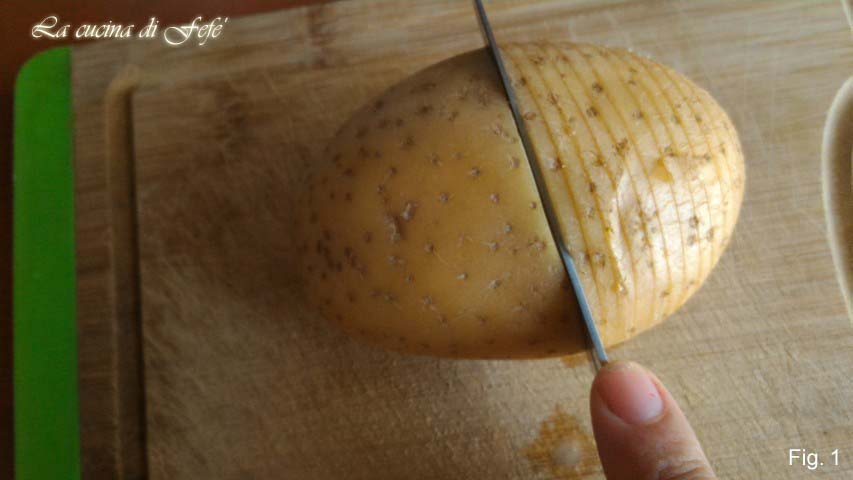 Commencez par bien laver les pommes de terre, en les frottant pour enlever tous les résidus de terre. Puis, séchez-les avec un torchon sec et incisez-les en procédant avec le type de coupe qui donnera l’aspect “en accordéon”, c’est-à-dire en créant des tranches très minces, sans toutefois atteindre la fin de la pomme de terre qui doit rester intacte.