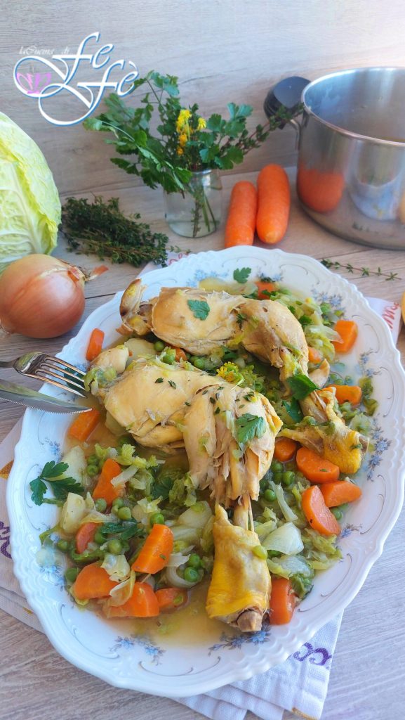 Vous savez que sur mon blog, il n’est pas dans mes habitudes de proposer des recettes à base de viandes rouges, mais quelques exceptions pour les viandes blanches, en effet, oui ! Aujourd’hui, je veux donc vous laisser une idée parmi les plus simples mais à mon avis, aussi parmi les plus bonnes et réconfortantes qui existent ! Je parle du poulet en ragoût avec petits pois, pommes de terre et chou vert ! Un plat très satisfaisant, surtout s’il est préparé lors de ces froides journées d’hiver ! Nous l’aimons beaucoup surtout pour son goût délicat et cette texture très tendre que présente la viande à la fin de la cuisson, au point de littéralement fondre dans la bouche ! De plus, cette version du poulet est sans aucun doute une excellente alternative à la cuisson au four. Mais passons à la recette, ou plutôt à ma manière personnelle de cuire les cuisses de poulet en cocotte. J’ai choisi d’abord du poulet fermier, car, comme on le sait, ayant grandi librement dans les champs et nourri uniquement de maïs, son, et avoine, il sera plus authentique et tendre. Le secret pour un bon résultat réside dans les herbes et quelques épices, ainsi que plusieurs légumes de saison qui rendront ce plat savoureux, sain et nutritionnellement complet ! Vous pourrez le servir à table ainsi, comme plat principal accompagné de son propre jus, ou si vous le souhaitez, vous pouvez le désosser, le réduire en lamelles et l’utiliser comme un délicieux bouillon pour les pâtes ! Assurez-vous que le type de pâtes soit strictement court ! Ce sera le parfait comfort food bien fumant et nourrissant qui plaira à toute la famille, enfants inclus !