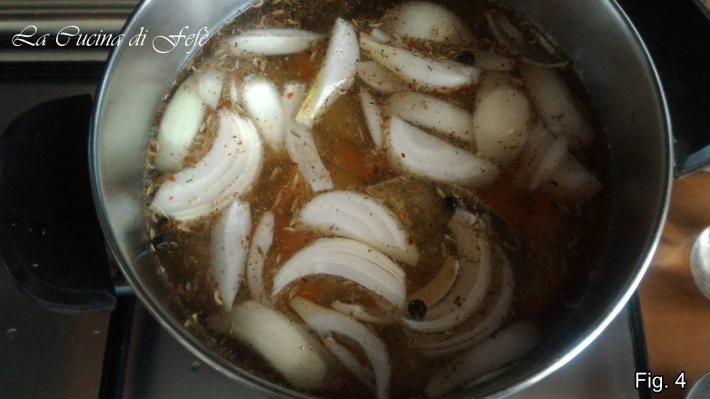 • Dans une grande casserole, faites dorer l’oignon 1′ à feu vif avec 2 cuillères à soupe d’huile, les feuilles de laurier et le mélange granulé, puis ajoutez également les carottes, les pommes de terre, les baies de genièvre et les graines de fenouil et d’anis. Laissez mijoter quelques minutes, couvrez d’eau chaude et baissez le feu (fig. 4). Après quelques minutes, ajoutez également les cuisses de poulet et le vin blanc et couvrez avec un couvercle (fig. 5).