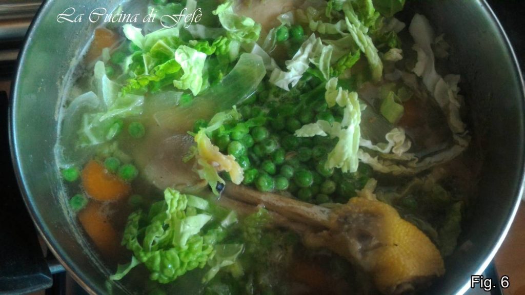 • Après environ 35′ du début de la cuisson du poulet, ajoutez les petits pois et le chou, puis couvrez à nouveau et laissez cuire à feu doux pendant environ 15′ en remuant de temps en temps (fig. 6).