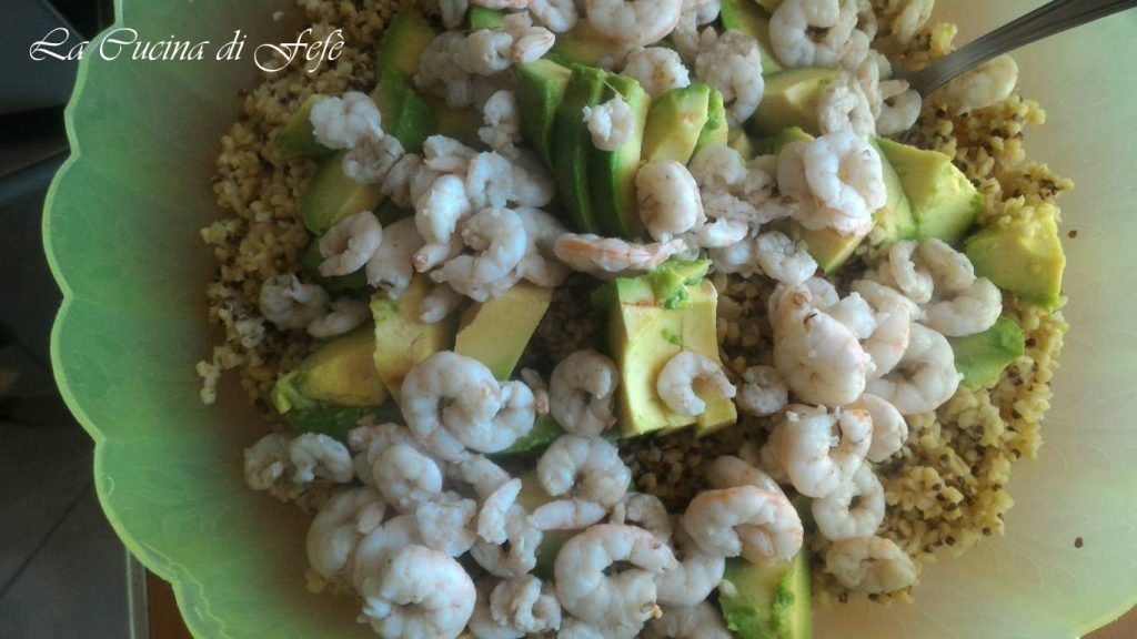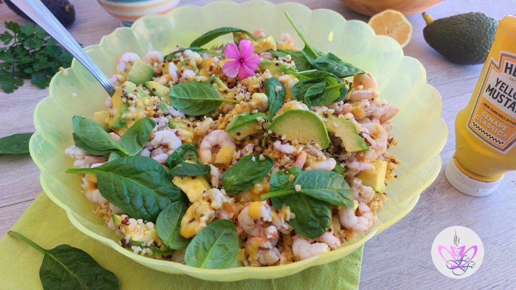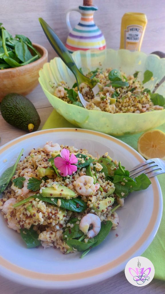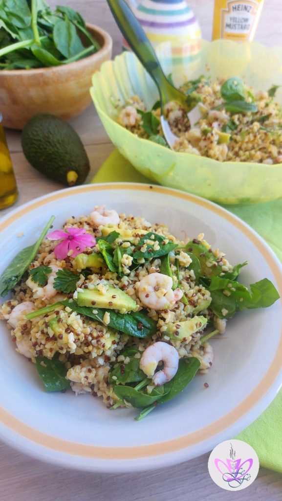 Si tu pensais que les salades de pâtes et de céréales étaient uniquement estivales, avec cette recette tu découvriras qu’il est aussi possible de consommer des plats frais en hiver comme cette quinoa aux crevettes et avocat. Ce plat te surprendra car il est vraiment très rapide et simple à réaliser, le temps de cuire la quinoa et de l’assaisonner. De plus, malgré sa simplicité, il se distingue par son goût raffiné et un peu exotique, parfait à proposer même pendant les fêtes de Noël en pratiques portions individuelles comme entrée. Sa particularité est la vinaigrette avec laquelle il est assaisonné, c’est-à-dire une émulsion typique de la cuisine française généralement à base d’huile d’olive extra vierge et de vinaigre de vin blanc. Dans mon cas, je l’ai légèrement revisitée, la rendant encore plus savoureuse et délicate, en remplaçant le vinaigre de vin par du vinaigre de cidre et en ajoutant du jus de citron et de la sauce moutarde jaune. Simple, facile et au résultat final vraiment surprenant! De plus, la quinoa est un aliment totalement sans gluten et, pour cela, il peut être consommé librement par ceux qui souffrent de la maladie cœliaque, remplaçant parfaitement une portion de céréales même si ce n’est pas le cas, car son utilisation et sa teneur nutritive sont très similaires! De plus, il fournit en même temps des protéines de haute valeur biologique, rendant ce plat, au-delà des fêtes, parfait en toute occasion, même comme plat à emporter au bureau ou comme plat à intégrer dans un régime sain et équilibré!