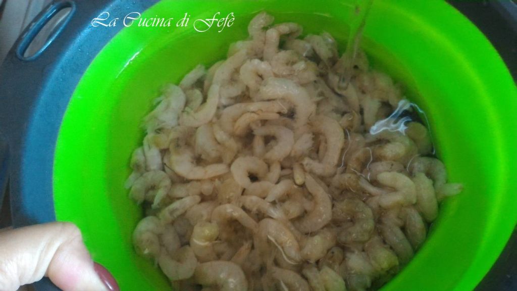 Dans une casserole, fais bouillir une grande quantité d’eau salée et blanchis les crevettes pendant 5′.