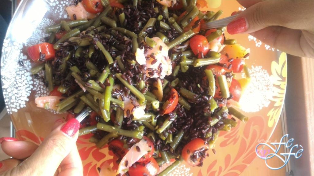 Cette année, à cause de la chaleur, nous nous sommes nourris principalement de salades, pas seulement celles classiques à base de laitue et tomates, mais aussi de pâtes et céréales ! J’en ai expérimenté de nombreuses, toutes fraîches, nutritives et satisfaisantes, mais surtout rapides à préparer, car beaucoup des ingrédients utilisés pour les assaisonner étaient ajoutés crus ! Celle que je vous présente aujourd’hui est l’une des rares exceptions, elle nécessite un légume à cuire préalablement, mais en une demi-heure, vous aurez tout assemblé et hop, au frigo ! Pour ce plat, j’ai choisi le riz noir, facilement reconnaissable par ses grains couleur ébène. C’est une variété italienne de riz cultivée dans la plaine du Pô, très aromatique et au goût inimitable. Le parfum que ce riz dégage pendant la cuisson est vraiment unique et offre une saveur particulièrement riche et corsée qui rappelle vaguement les noisettes grillées ! Habituellement, il s’associe avec des courgettes et des crevettes, une combinaison parmi les plus traditionnelles et gagnantes, mais essayez aussi ma version savoureuse avec du saumon fumé, des haricots verts et des pois chiches précuits, le tout agrémenté d’une poignée de roquette fraîche. Simple, authentique et riche en Oméga-3 et sels minéraux, cette salade sera le parfait repas à emporter à la plage sans se sentir lourd, offrant à votre corps tous les nutriments nécessaires pour affronter la chaleur estivale !