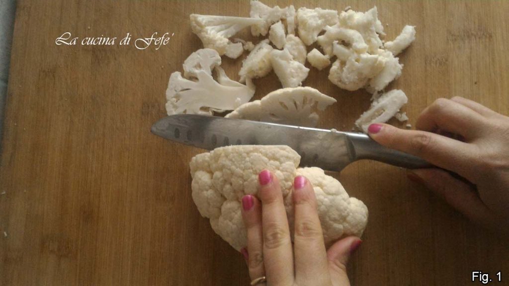 • Avec un couteau, réduisez le chou-fleur en fleurettes, puis lavez-les abondamment sous l’eau courante et séchez-les avec du papier absorbant de cuisine (fig. 1).