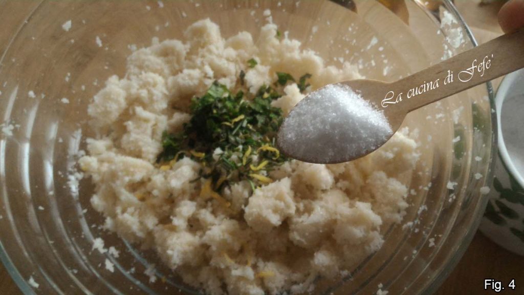 • Remettez le chou-fleur râpé dans un bol et ajoutez les herbes aromatiques, le basilic et la menthe émiettés et la ciboulette, les zestes de citron et le sel (fig. 4).