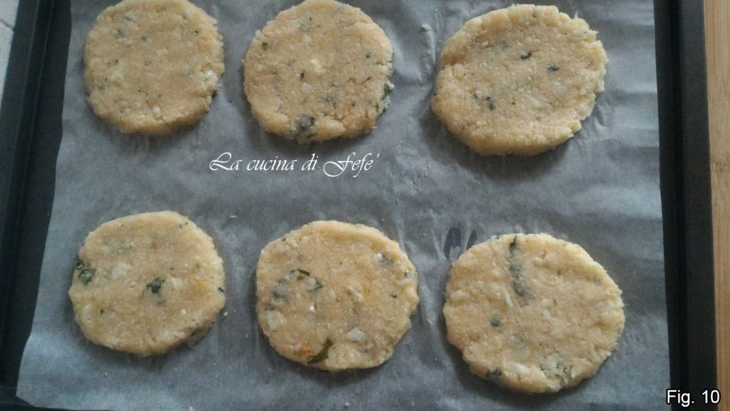 • Avec l’aide de deux cuillères légèrement humides, prélevez des portions de mélange et formez des galettes directement sur le papier cuisson en les aplatissant avec le dos de la cuillère (fig. 9).