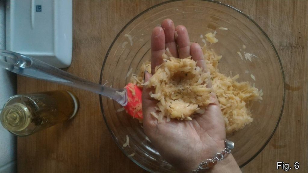 Ajoutez une pincée de sel, mélangez et laissez reposer une vingtaine de minutes, le temps qu’elles libèrent leur amidon (fig. 2). Passé ce temps, pressez-les avec les mains ou avec un torchon propre si vous préférez, et transférez les pommes de terre petit à petit dans un autre grand saladier (fig. 3).