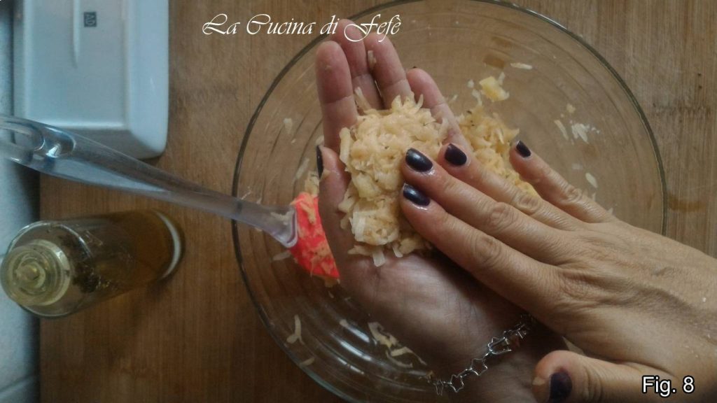 Refermez vos rösti avec une autre petite portion de pommes de terre et aplatissez avec les mains (fig. 8). Procédez ainsi jusqu’à épuisement de la pâte, disposez toutes les galettes de pommes de terre obtenues sur une plaque de cuisson recouverte de papier sulfurisé, arrosez d’un filet d’huile en surface et faites cuire dans un four ventilé à 200°C pendant 15 minutes, puis retournez-les et activez le grill pendant 5-8 minutes ou jusqu’à dorure (fig. 9).