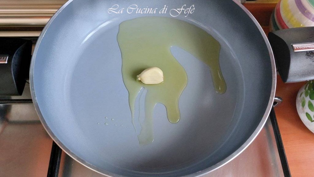 Fais chauffer dans une casserole 2-3 cuillères à soupe d’huile d’olive extra vierge avec la gousse d’ail et fais revenir pendant environ deux minutes à feu modéré.