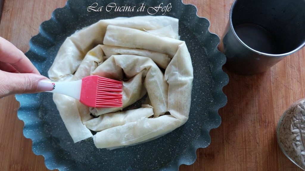 Badigeonne chaque couche de pâte filo avec de l’huile d’olive extra vierge ou du beurre fondu. Cela crée des micro-bulles d’air qui gonfleront dans le four, conférant la consistance typique « en millefeuille »