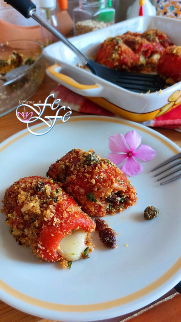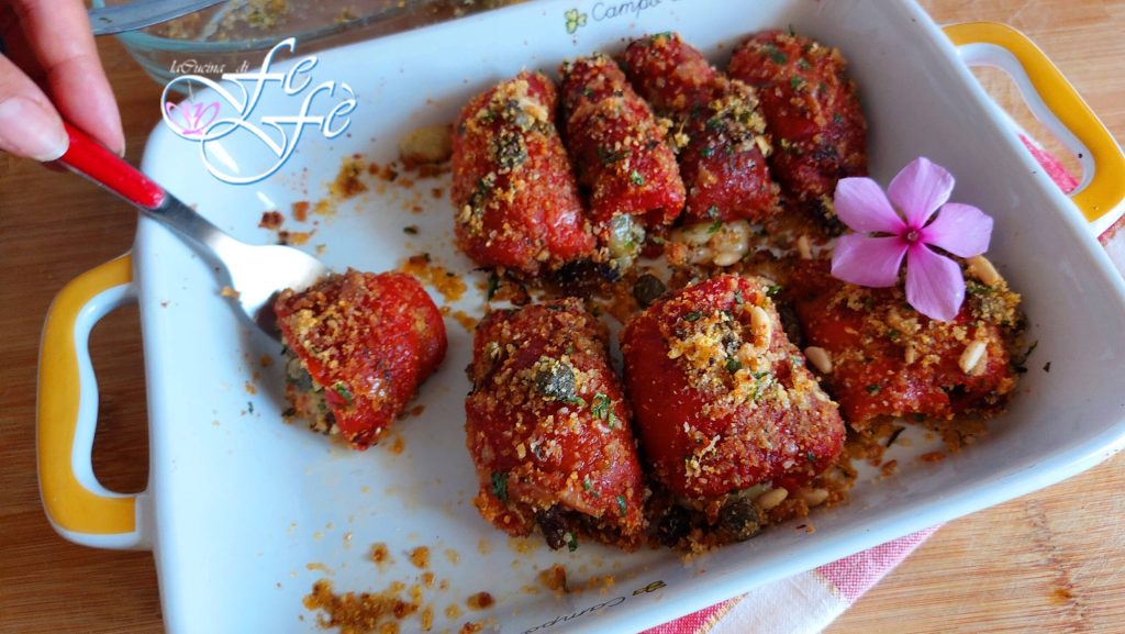 En été, comme d’habitude, je profite de leur saisonnalité pour faire le plein de poivrons! Sans hésiter, je pourrais dire que j’en apprécie toutes les caractéristiques : le goût, leur parfum inimitable juste cuits et, non des moindres, leur polyvalence ! Tant et si bien que vous pourrez préparer tout ce que vous voulez, apportant toujours à table des accompagnements simples et authentiques ou des plats plus élaborés et savoureux. C’est vrai, direz-vous, ils sont un peu difficiles à digérer, crus ils sont sûrement lourds pour l’estomac, mais je vous garantis que dans toutes mes recettes où les poivrons sont les protagonistes, une cuisson préalable au four est obligatoire ! Je sais, devoir rôtir les poivrons avant de les nettoyer et de les émincer, c’est toujours un peu ennuyeux, mais ça en vaudra vraiment la peine ! Dans cette recette que je vous propose, cette opération fera vraiment la différence ! Il s’agit d’un deuxième plat auquel je suis très attachée pour des raisons territoriales et même affectives, en effet c’est une vieille recette de famille éprouvée que nous préparons depuis des générations, à savoir les poivrons en rouleaux avec un remplissage irrésistible ! Les ingrédients sont évidemment typiquement siciliens : chapelure, caciocavallo, raisins secs, olives, pignons de pin et herbes aromatiques. Une fois farcis, ces rouleaux seront simplement passés au four pour gratiner pendant quelques minutes et à la fin, vous pouvez me croire, ils seront incroyables!