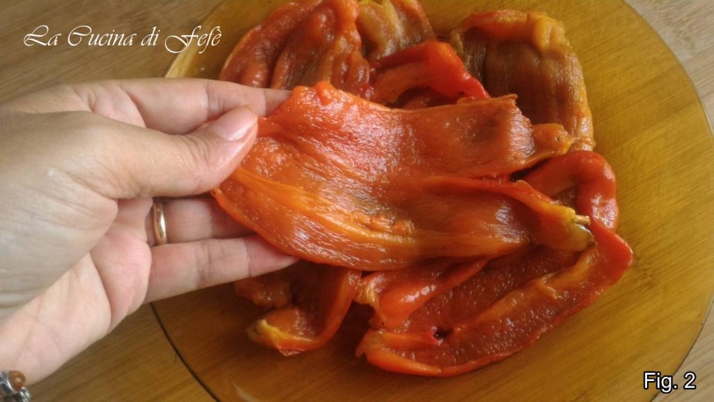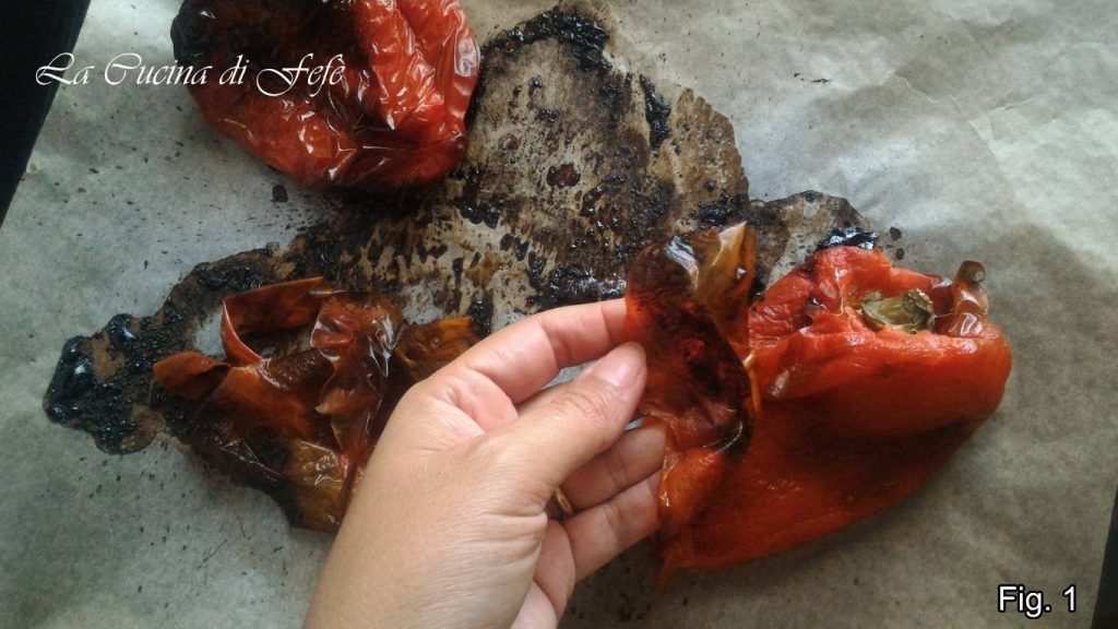 Lavez les poivrons et disposez-les sur une plaque recouverte de papier cuisson. Faites cuire pendant 30′ ou jusqu’à ce qu’ils soient bien grillés, puis éteignez le four et laissez-les à l’intérieur jusqu’au refroidissement complet. Une fois refroidis, retirez délicatement le sommet des poivrons, videz-les de l’eau et des graines, et pelez-les (fig. 1).