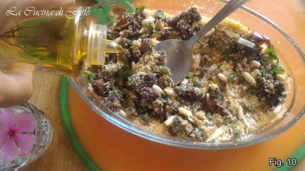 Disposez-les au fur et à mesure sur une grande planche ou un plateau et réservez (fig. 8). À la panure restante, ajoutez maintenant les raisins secs préalablement trempés dans de l’eau tiède pour les réhydrater, puis pressés, les olives, les câpres et les pignons de pin (fig. 9).