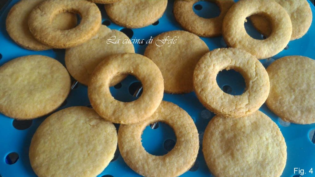 Après le temps de repos, étalez la pâte avec un rouleau à pâtisserie sur un plan de travail légèrement fariné jusqu’à une épaisseur de 5 mm et, en utilisant un emporte-pièce rond, découpez de nombreux disques, puis faites un trou central dans la moitié des formes préparées (fig. 2).