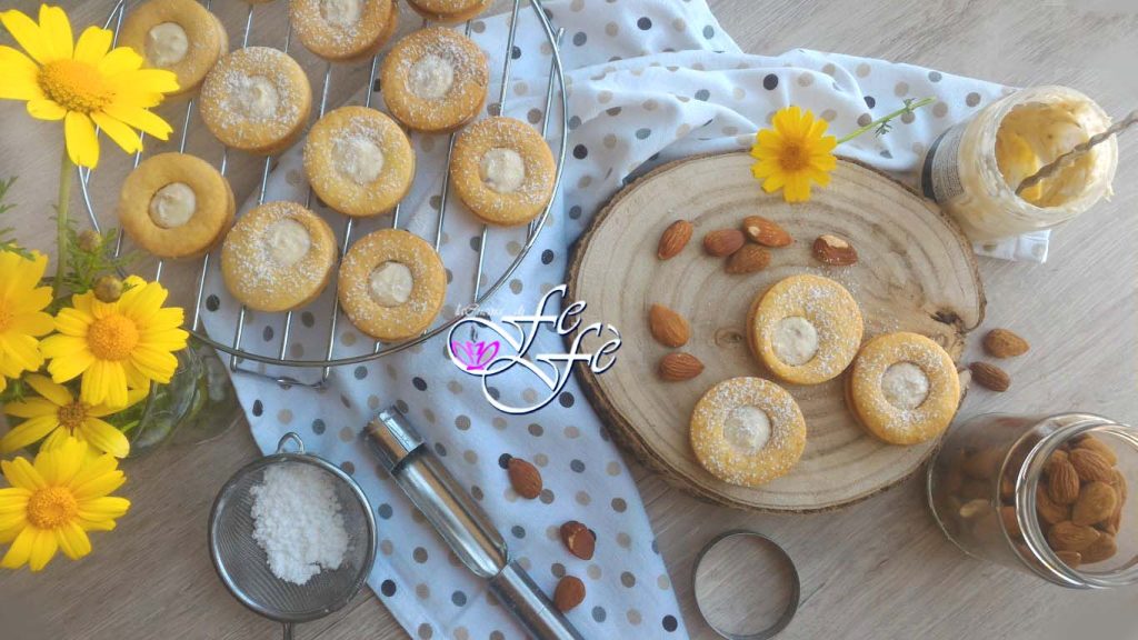 Le week-end dernier, profitant du temps plutôt incertain, j’ai pensé que finalement ce serait agréable de rallumer le four et de me consacrer à préparer ces biscuits qui sont vraiment spéciaux ! La chaleur dans la cuisine et leur parfum dans toute la maison ont été pleinement satisfaisants, mais une fois refroidis et garnis, c’était vraiment la dégustation le meilleur moment ! Je vous dis tout de suite que la friabilité et la gourmandise domineront ! Eh oui, car ces biscuits seront une douce surprise pour le palais en termes de texture et de saveur. Ce sont de véritables petits gâteaux réalisés avec une pâte sablée aux amandes, qui fond littéralement dans la bouche. De plus, ils sont rendus gourmands par une irrésistible crème aux amandes et aux noisettes hachées, si satisfaisante, que vous ne pourrez pas vous empêcher d’en manger un autre puis encore un autre ! Donc, doublez les doses si, comme moi, vous aimez en avoir toujours une bonne réserve dans le placard pour les bonnes occasions ! Ils sont vraiment faciles à réaliser et seront parfaits pour un goûter gourmand, un thé de cinq heures ou un petit dessert de fin de repas accompagné d’un amer ou d’une liqueur aromatique.