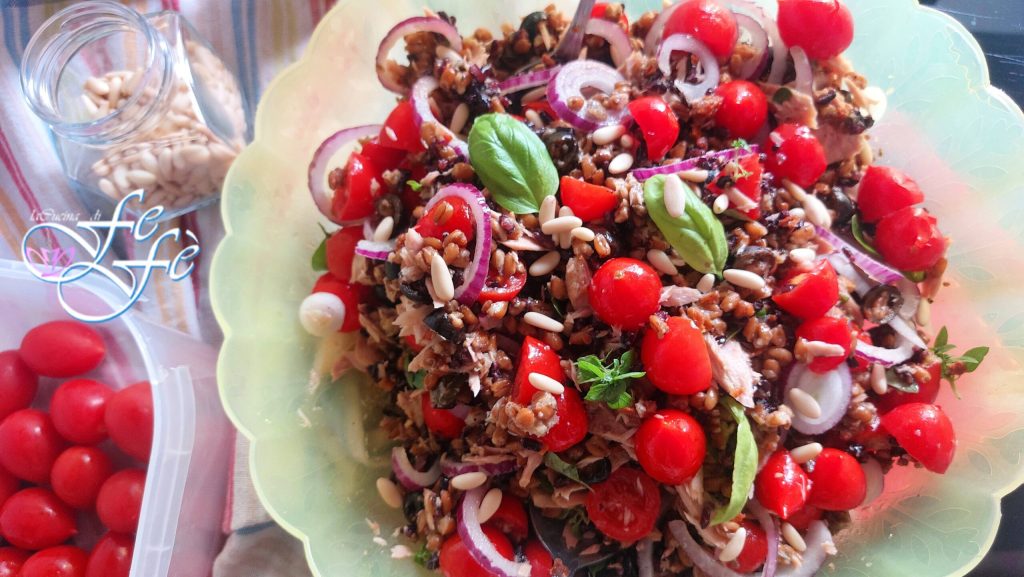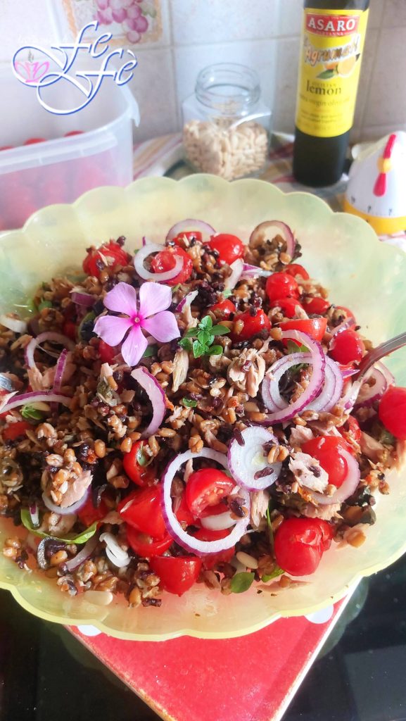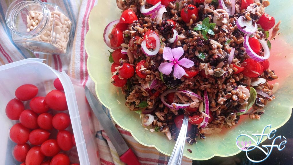 Bien que la chaleur ici en Sicile ne semble pas vouloir diminuer, au contraire, ces jours-ci le taux élevé d’humidité l’a rendu encore plus insupportable, avec cette recette je clos officiellement la section salades d’été ! Eh oui, car nous sommes déjà à la mi-septembre et il ne reste plus que dix jours avant l’arrivée de l’automne, donc je veux partager avec vous cette belle et fraîche recette tant que les températures le permettront ! Il s’agit d’un plat principal à base de riz rouge et de céréales, excellentes alternatives aux pâtes, riches en fibres, en vitamines et en goût. J’ai acheté un mélange déjà prêt, mais si vous ne le trouvez pas, vous pouvez utiliser les céréales que vous avez dans votre placard ou que vous préférez. Le résultat est un plat coloré, parfumé et sain, facile mais surtout rapide à réaliser puisque tous les ingrédients, à part les céréales, sont ajoutés crus ! Un plat unique qui s’inspire des saveurs méditerranéennes, en effet il est enrichi de filets de thon rouge, dans mon cas achetés à Marzamemi auprès d’une entreprise de pêche renommée, de tomates cerises, d’oignons calabrais, de câpres de Salina, de pignons, d’olives et plein de basilic ! Un plat simple mais stimulant, parfait à déguster à la mer pour ceux qui sont encore en vacances, en plein air, dans le jardin, ou à emporter en lunchbox au bureau ! Vous verrez, ce sera votre joker de l’été, mais aussi de l’automne si vous changez simplement les légumes par d’autres de saison !
