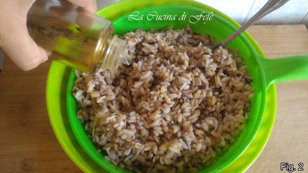 Commencez par rincer le mélange de céréales et riz rouge sous l’eau courante, puis portez à ébullition une casserole remplie d’eau salée, versez les céréales avec le riz et faites cuire à feu doux pendant le temps indiqué sur l’emballage, dans mon cas 10′ (fig. 1).