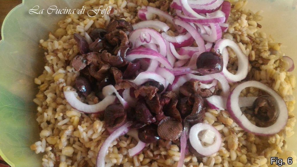 Épluchez un oignon rouge, coupez-le en rondelles, laissez-le tremper 10′ dans de l’eau puis égouttez-le bien ou pressez-le (fig. 4). Dessalez les câpres sous l’eau courante, retirez les noyaux des olives et coupez-les en tranches (fig. 5).