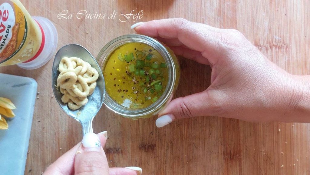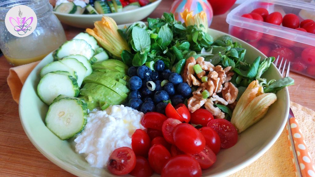 Contre toute attente par rapport à l’idée commune du concept de salade, cette fois encore je me suis vraiment surpassée ! Si j’entends encore quelqu’un dire que les salades sont ennuyeuses et adaptées uniquement à ceux qui sont au régime, je lui apporterai un traité sur ce type de plat, souvent sous-estimé ! Et pourtant, en plus d’être le symbole par excellence de la santé et du bien-être, la salade aujourd’hui est conçue comme un plat unique riche en couleurs et saveurs bien assorties et étudiées ! Bref, une combinaison stratégique d’ingrédients qui désormais peut plaire à tout le monde, même aux plus petits !! Celle que je te recommande aujourd’hui est phénoménale ! Le protagoniste absolu est la mâche, connue de beaucoup aussi sous le nom de valeriane ou doucette, à ne pas confondre cependant avec la valériane officinale, très utilisée en phytothérapie comme calmant naturel. Cette plante herbacée annuelle a de nombreuses propriétés bénéfiques, très peu de calories et beaucoup de fibres, donc une excellente aide pour ceux qui ont besoin de retrouver la régularité intestinale ! En toile de fond de cette recette, les myrtilles, super antioxydants, les noix riches en oméga 3 et oméga 6, et l’avocat, source de vitamines, minéraux et acides gras monoinsaturés. À l’intérieur, j’ai ajouté les fleurs de courgette, riches en caroténoïdes, dont les graines plantées en automne à partir des restes de diverses courges, sont aujourd’hui devenues des plantes qui produisent de magnifiques fleurs en grandes quantités ! L’ajout du fromage cottage, garantit un apport de protéines et, enfin, les concombres et tomates cerises offrent dans le premier cas des propriétés purifiantes et diurétiques, et dans le second, une action anti-âge. Ce mélange est ensuite sublimé par une sauce spéciale qui te fera sûrement changer d’avis ! Elle sera parfaite comme lunch à emporter au bureau ou, si tu es déjà en vacances, tu pourras l’emporter confortablement à la plage, en variant selon tes goûts !