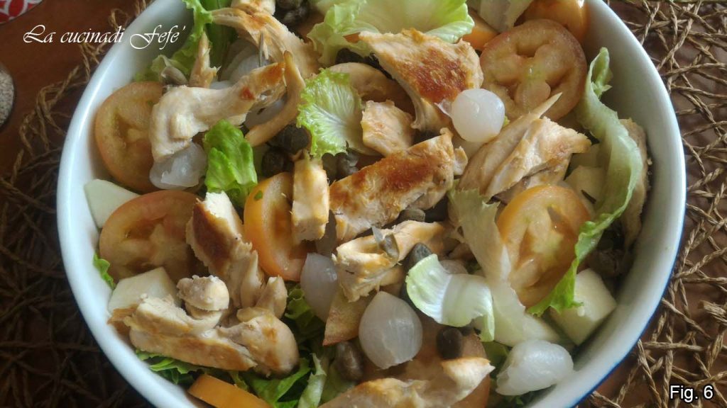 Ajoutez également les tomates oblongues préalablement lavées et coupées en rondelles, les lanières de poulet désormais froides, les câpres dessalés sous l’eau courante et bien égouttés et les petits oignons au vinaigre.