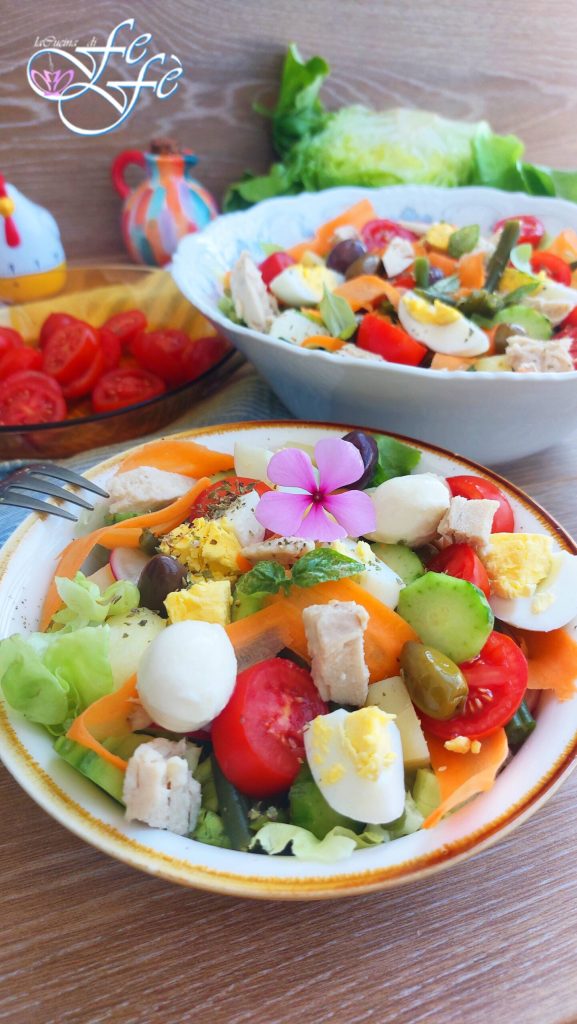 Amis, aujourd’hui je vous propose une recette qui, comme un bouche-à-oreille, m’a été suggérée par une amie qui, à son tour, a découvert son existence grâce à une autre amie ! Bref, vous savez comment ça se passe entre femmes ? On échange des idées, des suggestions, des conseils, et le résultat est toujours très stimulant et particulièrement constructif. Dans ce cas, grâce à elles, j’ai pu découvrir la salade niçoise, en français salade niçoise, un plat typique de la Côte d’Azur et en particulier de Nice. Cependant, cette salade s’est désormais répandue dans toute la région méditerranéenne, bien qu’avec de nombreuses variantes. La version la plus connue en Italie, par exemple, est celle de la Ligurie qui prend le nom de condiglione. Indéniablement, le dénominateur commun est toujours un plat frais, parfait en été pour résoudre un déjeuner ou un dîner lorsque les températures commencent à monter ! Les protagonistes incontestés sont les haricots verts, déjà présents sur les étals des fruits et légumes, mais aussi la salade verte, les pommes de terre, le thon, les tomates, les œufs, parfois les anchois et bien d’autres, assaisonnés d’une généreuse dose de vinaigrette à base d’huile d’olive extra vierge et de vinaigre. Bref, une salade, mais avec un apport protéique indéniable et un goût riche qui attribue à ce plat une définition bien plus large que celle d’un simple accompagnement ! Bref, une explosion de couleurs et de saveurs, un repas nutritif et équilibré qui le transforme en entrée, voire même en plat unique ! Emportez-le avec vous à la plage, lors d’un pique-nique en plein air ou à déguster peut-être dans le jardin quand on a peu envie de cuisiner, car, à part quelques ingrédients, tout se coupe rapidement et se mange cru !