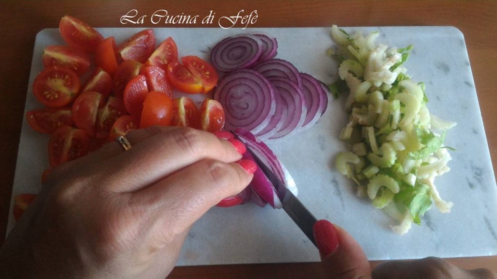 À part, lavez et nettoyez les légumes. Coupez le cœur de céleri en morceaux, l’oignon rouge en fines tranches et les tomates cerises en deux dans le sens de la longueur.