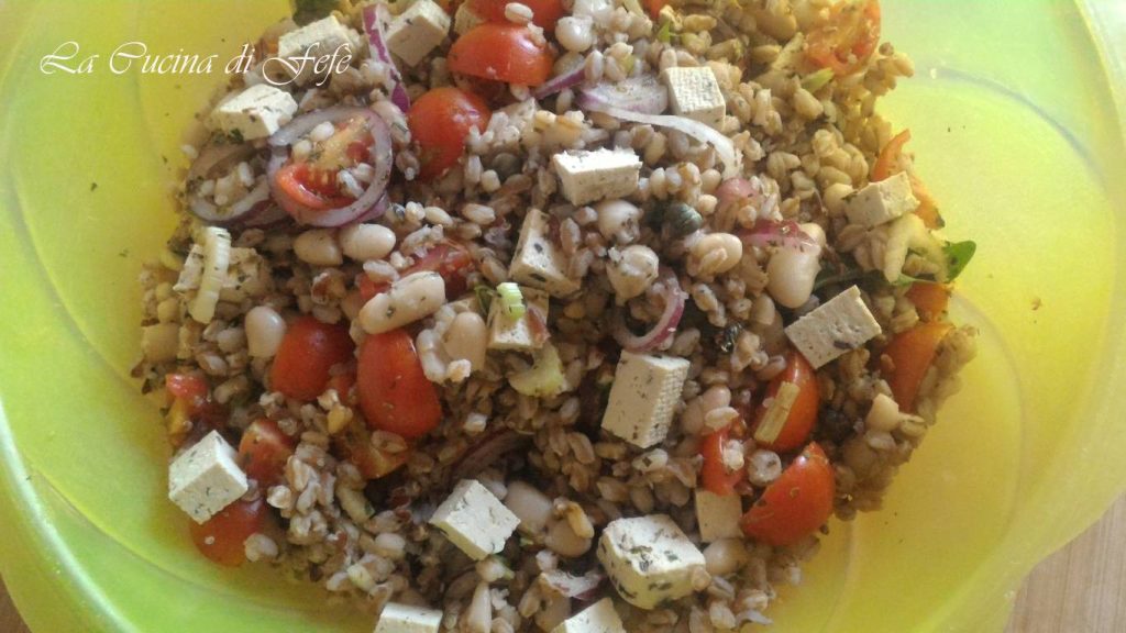 Après une courte mais régénérante pause de vacances, je suis retournée en cuisine avec un nouveau plat frais et authentique de style végétalien, riche en protéines végétales et sels minéraux ! En cette période, la chaleur exténuante et le peu d’envie d’allumer le four ou de se mettre aux fourneaux appellent des repas plus frugaux et légers, donc mieux vaut apporter à table des plats uniques comme cette salade ! L’assaisonnement avec du tofu aux herbes est la base parfaite pour tout type de céréales, dans mon cas j’ai choisi un mélange d’épeautre et de quinoa, mais vous pouvez opter pour d’autres choix ou ce que vous avez dans le garde-manger, alors il ne vous reste plus qu’à vous amuser ! En outre, cela se prépare très rapidement puisque les ingrédients sont ajoutés tous crus, donc pas de tracas en cuisine et en une demi-heure, à part un court repos au réfrigérateur, vous aurez résolu le déjeuner ou le dîner ! Préparé à l’avance, il s’enrichira davantage en saveur et sera parfait à emporter avec vous à la mer ou en tant que lunch box au bureau si vous n’êtes pas encore en vacances ! Nous l’avons beaucoup aimé, essayez-le aussi !