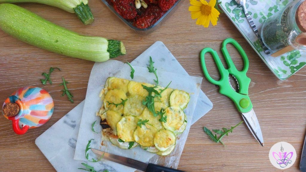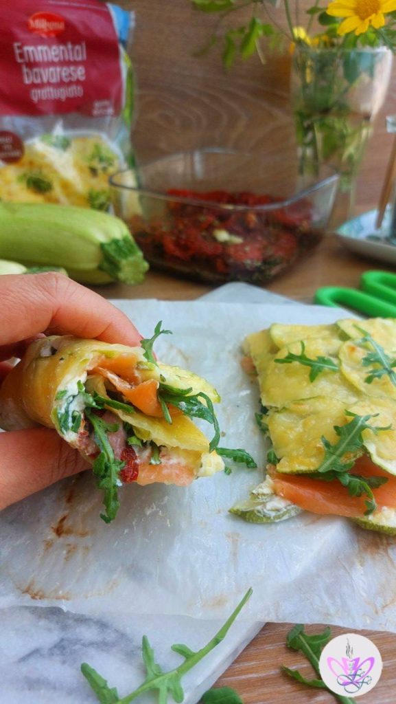 Ceux qui me connaissent savent combien j’aime faire preuve de créativité avec les légumes et proposer des plats toujours différents ! Les sandwichs de courgettes répondent à ce besoin car ils sont une solution vraiment facile et extrêmement rapide pour consommer un brunch léger, sain et satisfaisant. Coupez la courgette en rondelles pas trop fines, disposez-les en file, en les superposant, sur une plaque recouverte de papier sulfurisé et recouvrez-les de fromage râpé. Le temps de cuisson au four et le tour est joué ! Vous aurez obtenu deux sandwichs à garnir selon vos envies. À l’intérieur, j’ai mis du fromage à tartiner, des tomates séchées, de la roquette et du saumon fumé, mais les possibilités sont infinies, par exemple en ajoutant des charcuteries ou d’autres fromages. Les sandwichs de courgettes peuvent également être cuits dans une friteuse à air, donc à la fin de la recette, vous trouverez les temps de cuisson pour cette méthode aussi. Ils seront parfaits à emporter pour une sortie en plein air ou comme déjeuner au bureau. Si vous les préparez pour toute la famille, je vous invite à doubler les doses et vous verrez qu’ils deviendront votre atout en cuisine !