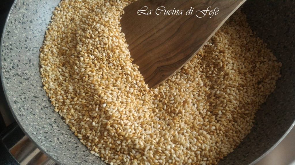 Mettez les graines de sésame dans une grande poêle antiadhésive et faites-les griller à feu doux pendant environ 4′-5′ en continuant de remuer avec une louche en bois*.