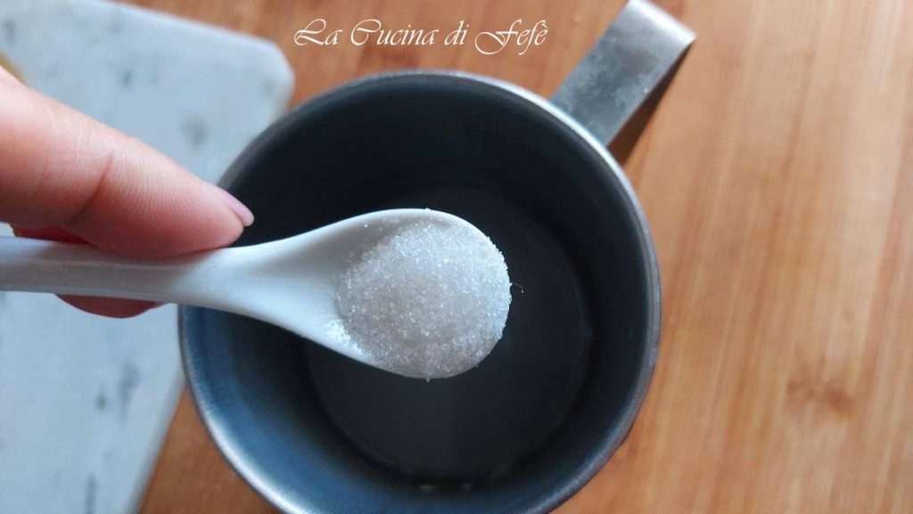 Dans un bol ou une casserole, dissous la levure émiettée dans 125 ml d’eau à température ambiante avec le sucre et mélange bien.