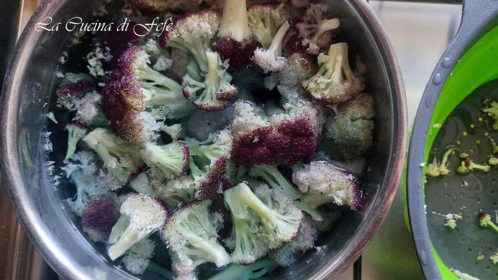 Entre-temps, après avoir bien rincé les bouquets de chou-fleur sous l’eau courante, blanchis-les pendant 5′ dans de l’eau bouillante salée.