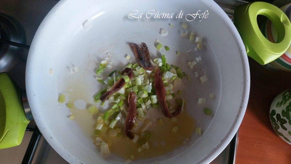 Dans une grande poêle antiadhésive, fais dorer les oignons nouveaux coupés en rondelles avec 2 cuillères à soupe bien pleines d’huile, ajoute aussi les anchois et laisse-les fondre à feu doux pendant quelques minutes.